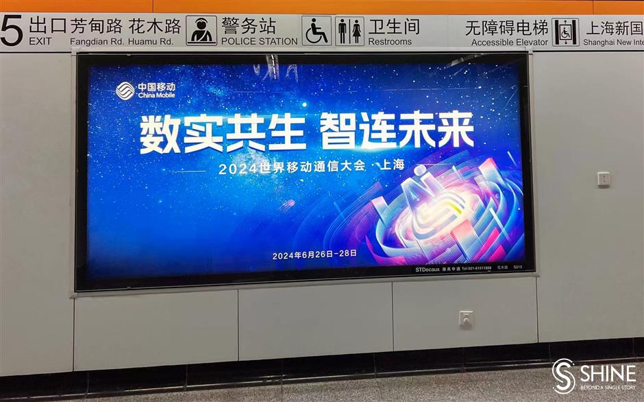 an advertisement for mwc shanghai 2024, asia's top telecom show, at a metro station in the pudong new area.