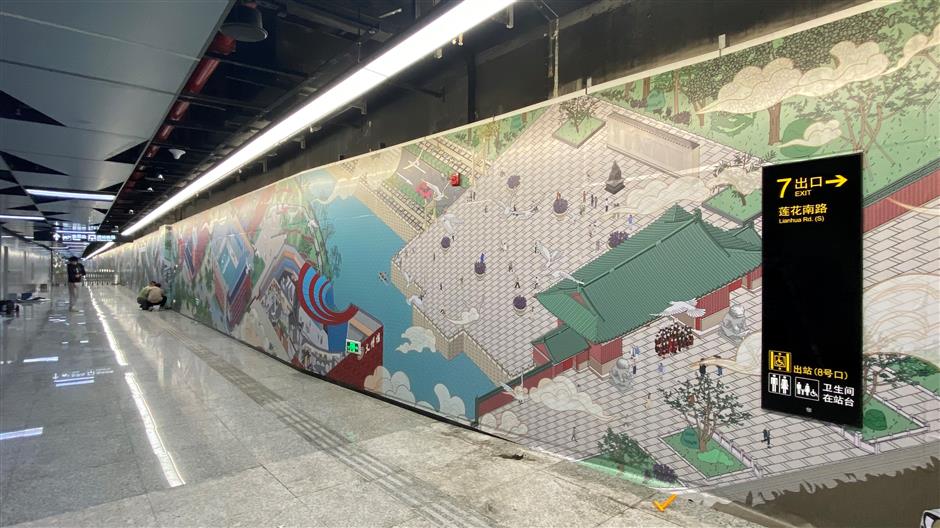 unveiled on saturday, the walls of the passage leading to exit 7 of the station now display a 143-meter-long painting of the university's minhang campus. it depicts landmark structures such as the tsung-dao lee library and the fok ying tung sports center.