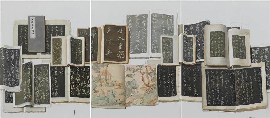 the second part of the exhibition features works by artists yan shanchun, yang xiaojing and zhou xiaoying. they all live and work around the west lake area in zhejiang province and share an obsession with antique books and the history of traditional art.