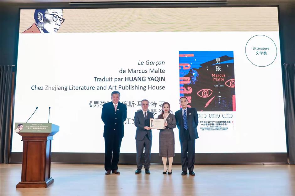 huang yaqin from shanghai scooped the literary award (4,000 euros) for her work on "the boy" by marcus malte, while the starup award went to wang xian, a shanxi native, who walked away 1,500-euros richer. wang translated didier eribon's "returning to reims."