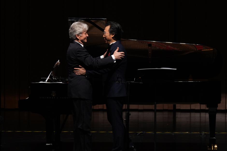 liao changyong (left) and hartmut höll acknowledge the audience after their first concert at the shangyin opera house.