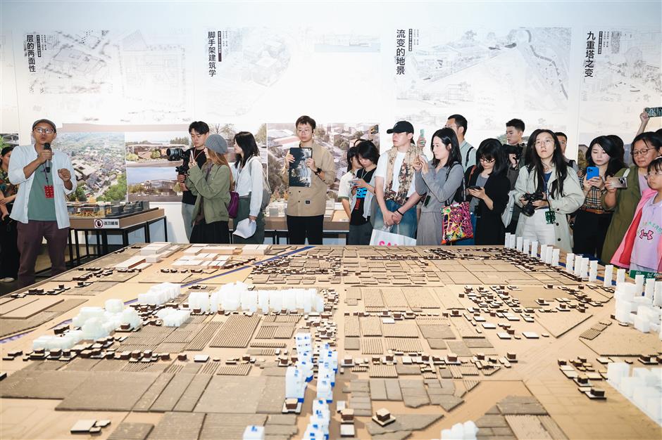 a graduate student from the china academy of art is presenting his architectural work to visitors.
