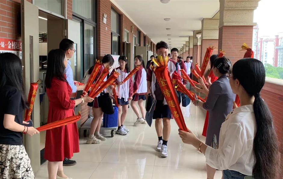 the national college entrance exam days from june 7 to 9 coincided roughly with the dragon boat festival holiday which fell from june 8 to 10 this year. seniors from a high school in minhang district received zongzi (sticky rice dumplings) as a gift from their school canteen and blessings from their teachers waving inflated "torches" as encouragement for good performance during the exams.