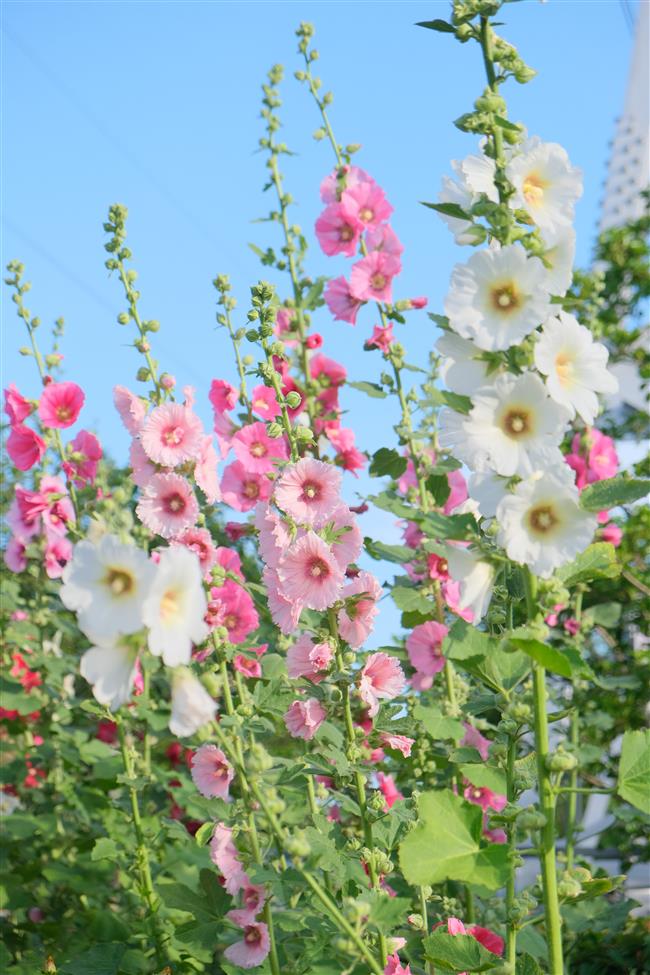 hollyhocks, known as "duanwu flower" in china, have created a vibrant carpet in the pengpu four season park at 1568 linfen road.