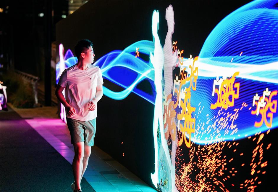 a man is attracted by the light installations of the 2023 shining shanghai festival.