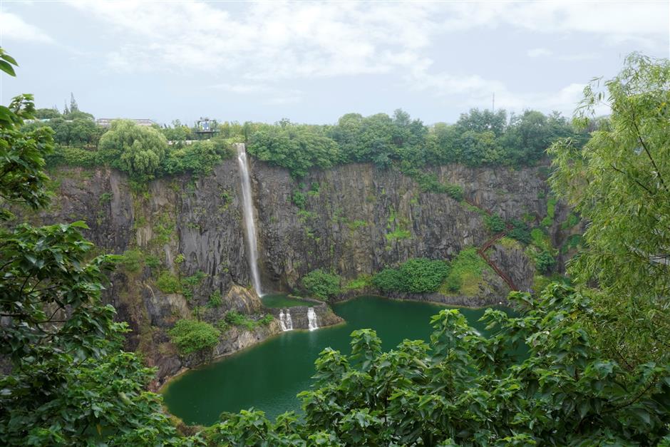 the highlight of the wonderland area is glass plank road, a glass-bottomed walkway which is the first in shanghai built on the edge of a cliff, 88 meters above the ground. it allows visitors to feel the sensation of floating between pools of water and the cliff. get an overview of the hotel, a large smurf sits at the bottom of the quarry and is waving to the visitors.