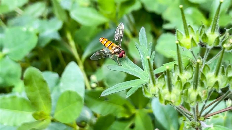 most people will mistake them for bees as they have a similar color and body shape. but they are actually a hoverfly. their larvae feed on aphids and the adult flies visit flowers for pollen. when you look closer, you can see they only have one pair of wings while bees have two pairs. by mimicking the dangerous bee, the fly can avoid disturbance and predation.