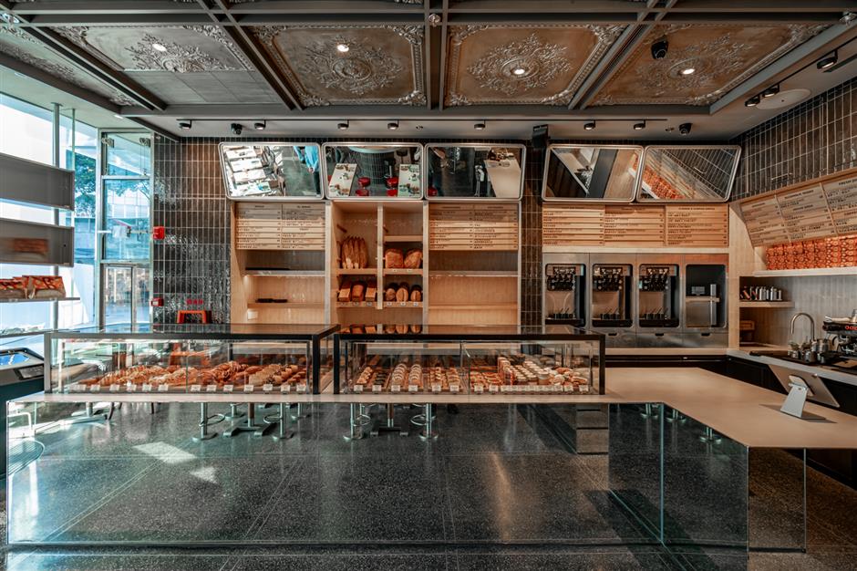 the bakery section displays baked in-house bread, viennoiseries, cakes and tarts.