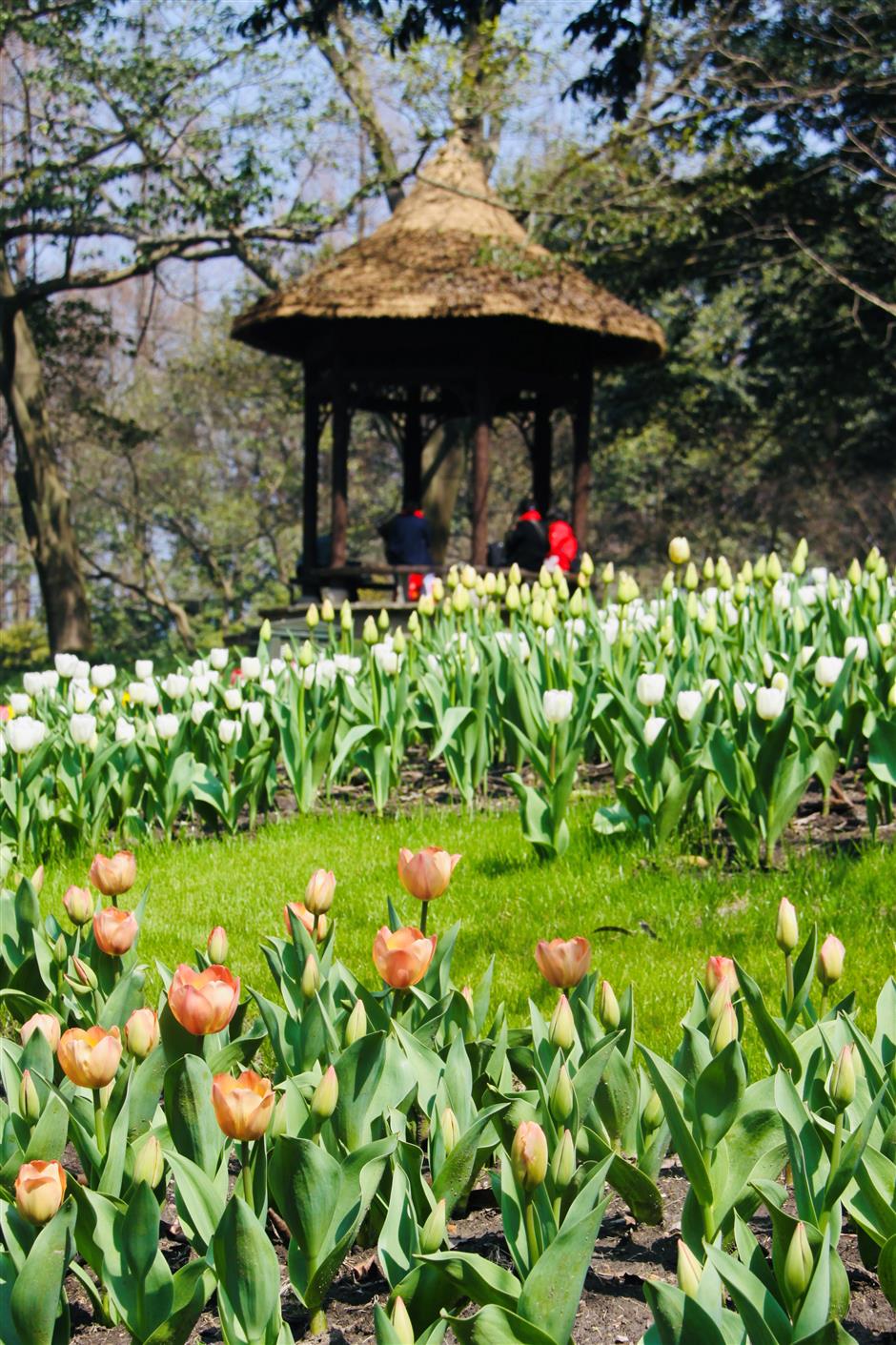over 400,000 tulips are beginning to bloom at hangzhou's taiziwan park. about 10 percent of the blossoms, ranging in hues of red, orange, pink and purple, have already burst into bloom beneath towering trees, near quaint ponds, weaving through meadows, and adorning the northern periphery of the park.