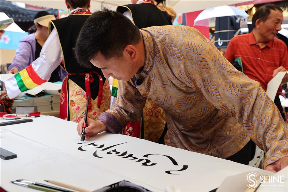 despite the rain, tourists were able to enjoy xizang-style calligraphy while local entertainers performed pop-up folk dances and songs, as well as staged folk costume fashion shows in yuyuan and at the bund.