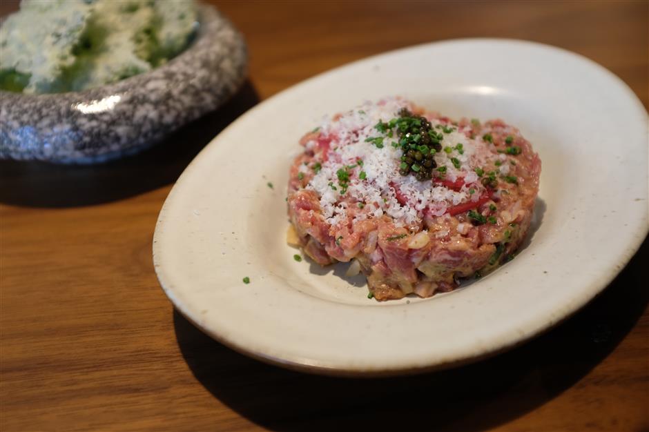 begin with beef tartar, which enhances the classic french dish with a dash of peppercorn and wasabi on crispy shiso, then proceed to roasted eggplant, where the unexpected combination of anhui preserved eggs on top of the roasted eggplant mash creates a dish full of robust flavors.