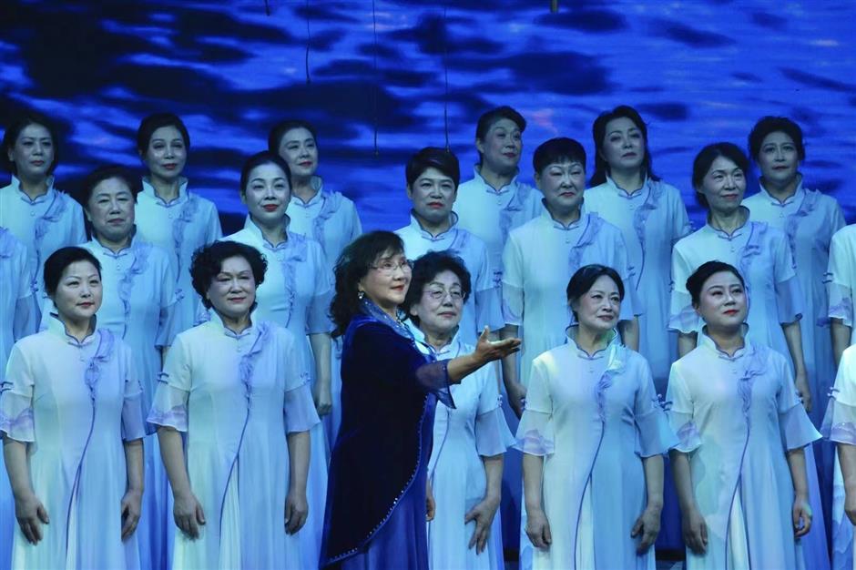 qi shanyun (center) and the shanghai female ceo chorus perform on stage.