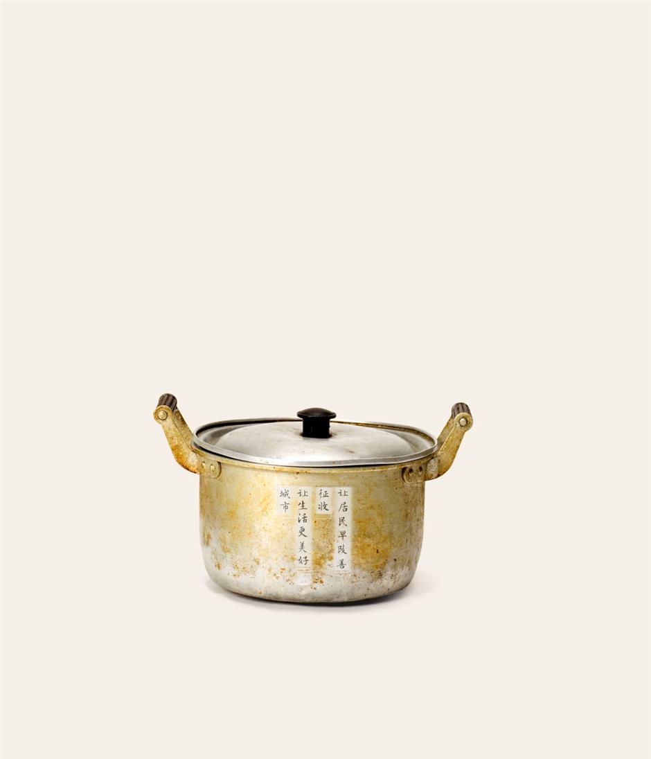 the picture of a discarded aluminum pot by photographer xu haifeng, collected from a house that was about to be demolished. he later added an expropriation slogan to it.