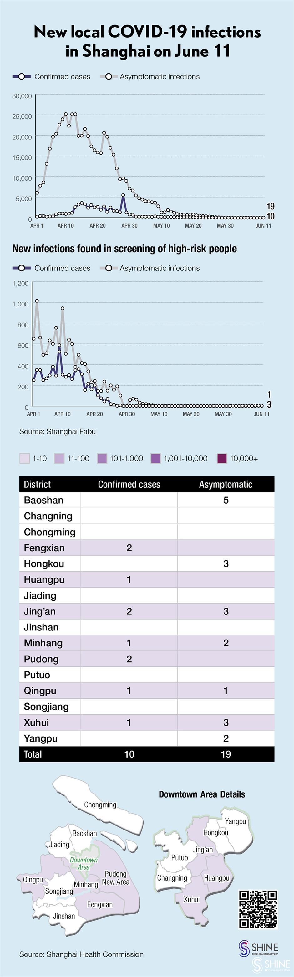 the city reported 10 locally transmitted covid-19 cases, 19 local asymptomatic infections, one imported case and three imported asymptomatic infections on saturday, said the shanghai health commission on sunday morning.