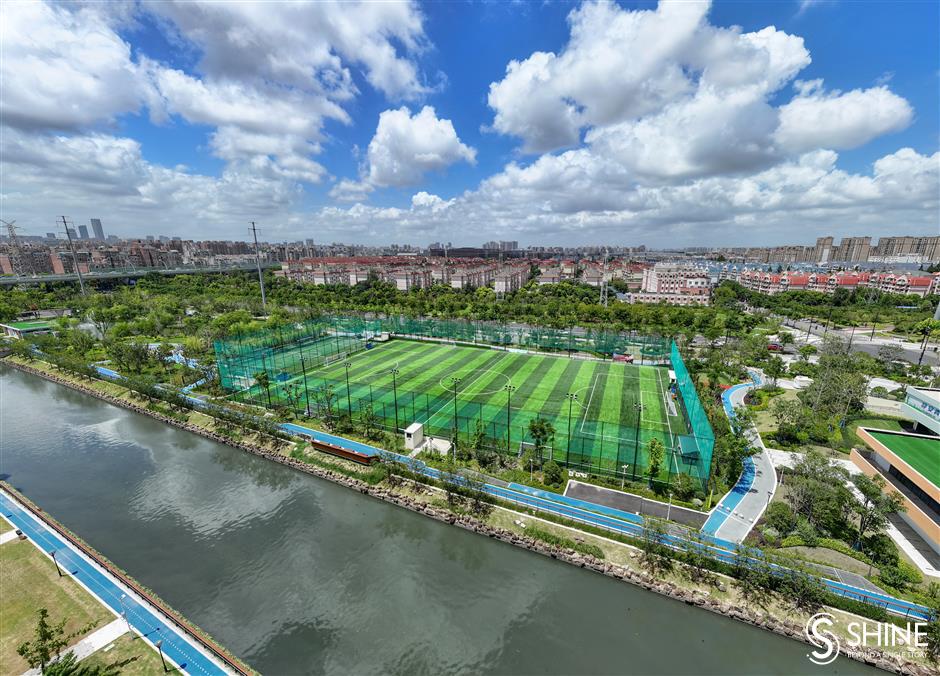 a bird's-eye view shows the pengyuepu greenway in jing'an district.