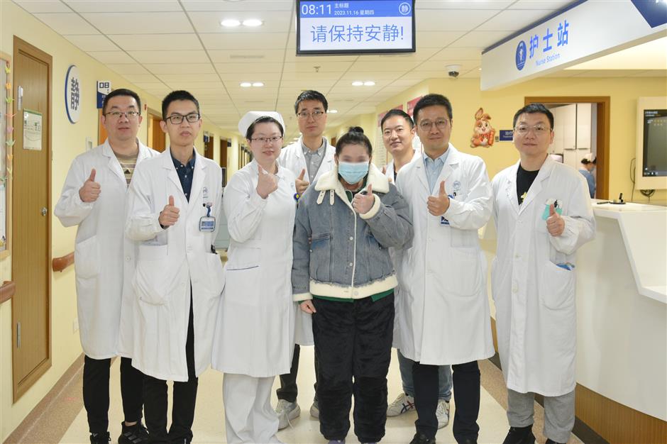a 26-year-old woman takes picture with her medics at shanghai chest hospital after a months-long stay in hospital.