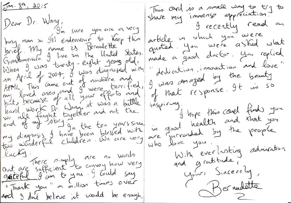 in 2015, a letter from a woman from the us reached him. bernadette giandomenico, who was a former apl patient, wrote to wang to express her gratitude after being cured by his therapy.