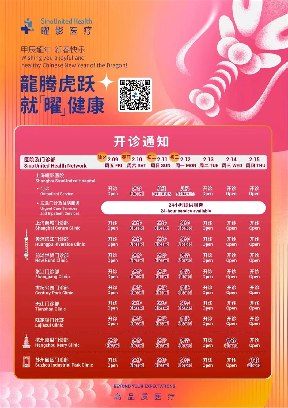 emergency services at local international hospitals and public hospitals will be available all day and night during the eight-day spring festival holiday, which begins on saturday. hospitals and clinics have also released their schedules for outpatients on their individual public wechat accounts and websites.