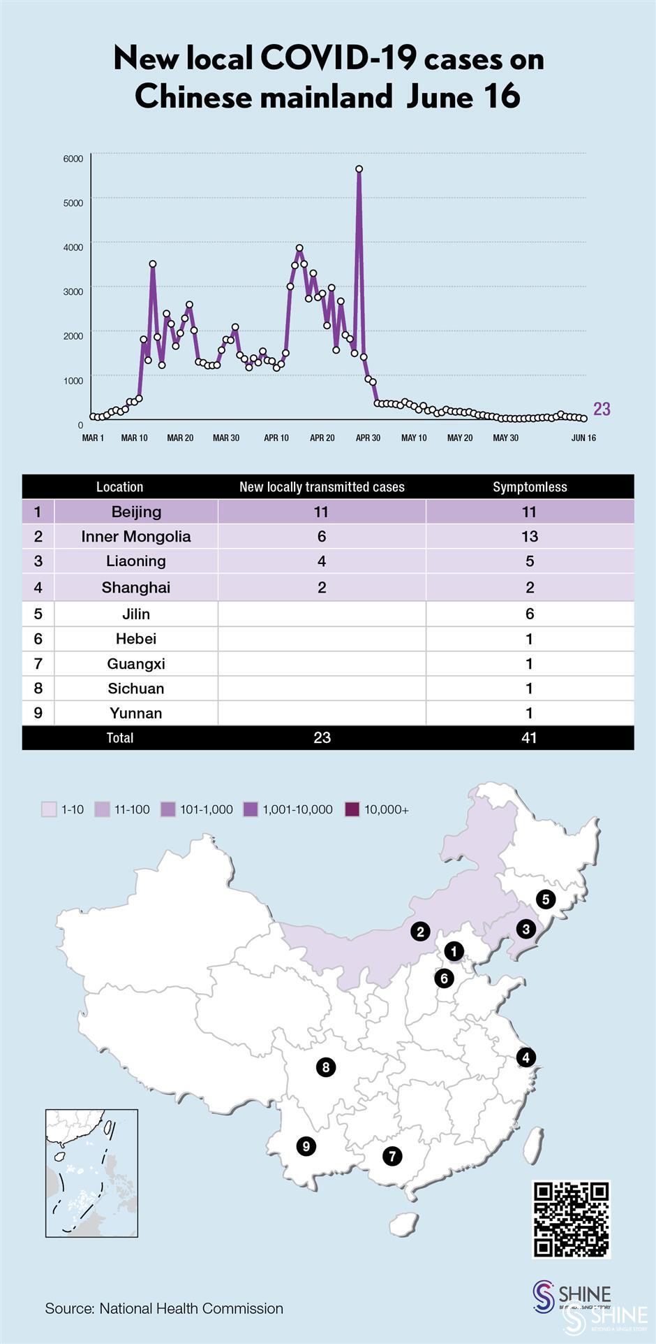 a total of 41 local asymptomatic carriers were newly identified in nine provincial-level regions, including 13 in inner mongolia, 11 in beijing, and six in jilin.
