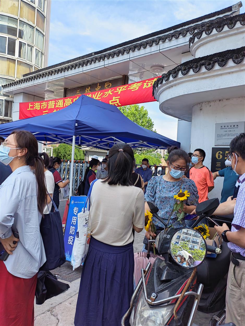 a teacher (right) hands out sunflowers to parents on june 18 outside the gate to a test center in salin middle school in pudong. the senior high school students sit for proficiency tests that are part of the college admission tests. the sunflower's relevance is linked to the chinese idioms yijuduokui and jiayou, which signify the parents' wishes for the best test results.